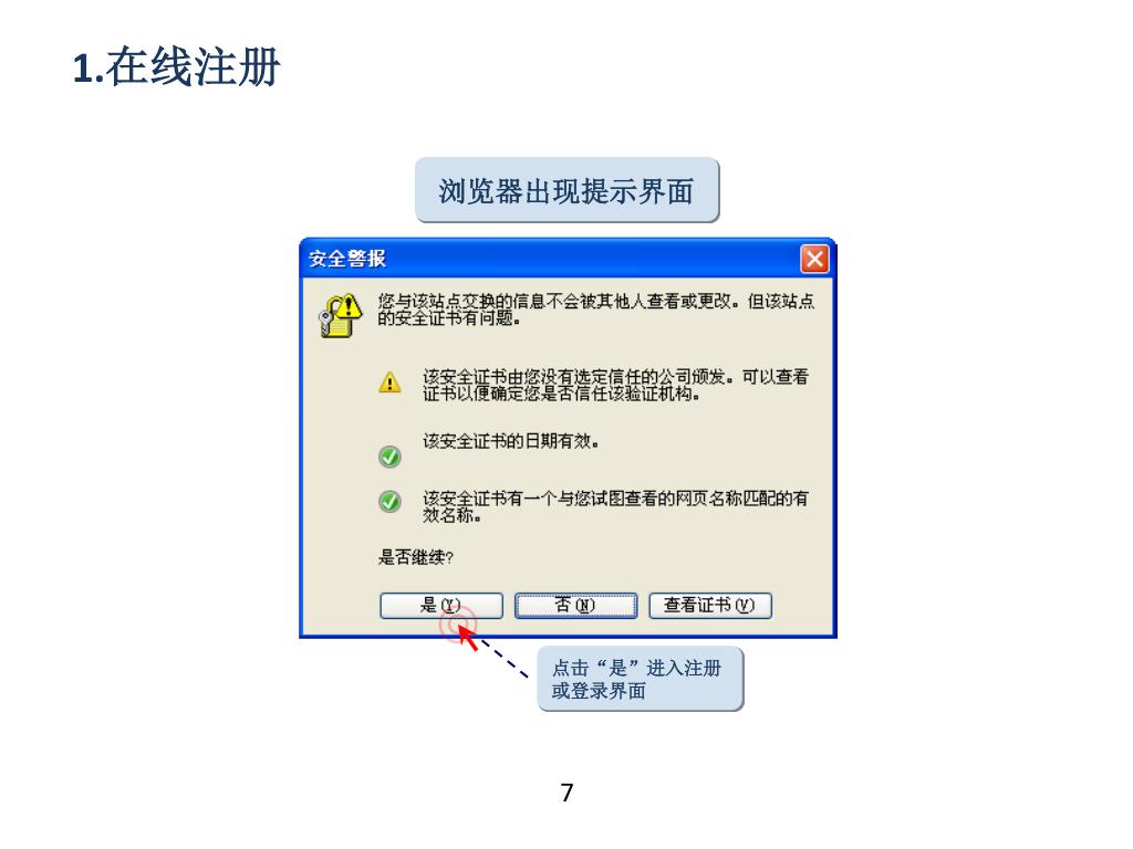 1.在线注册 浏览器出现提示界面 点击“是”进入注册或登录界面 7