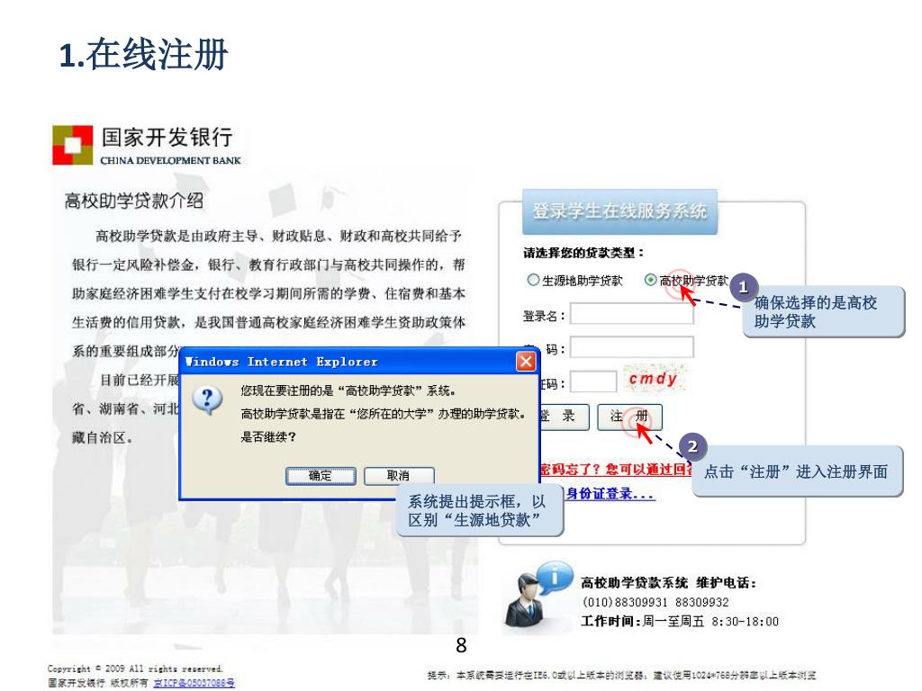 1.在线注册 1 确保选择的是高校助学贷款 2 点击“注册”进入注册界面 系统提出提示框,以区别“生源地贷款” 8