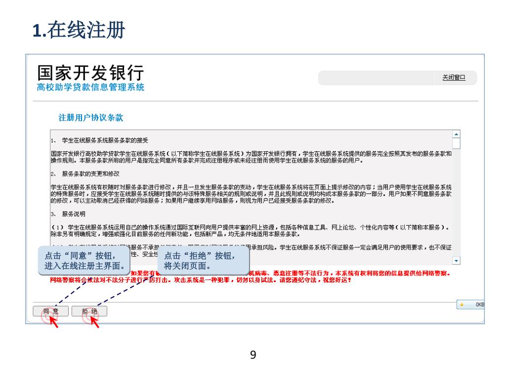 1.在线注册 点击“同意”按钮,进入在线注册主界面。 点击“拒绝”按钮,将关闭页面。 9