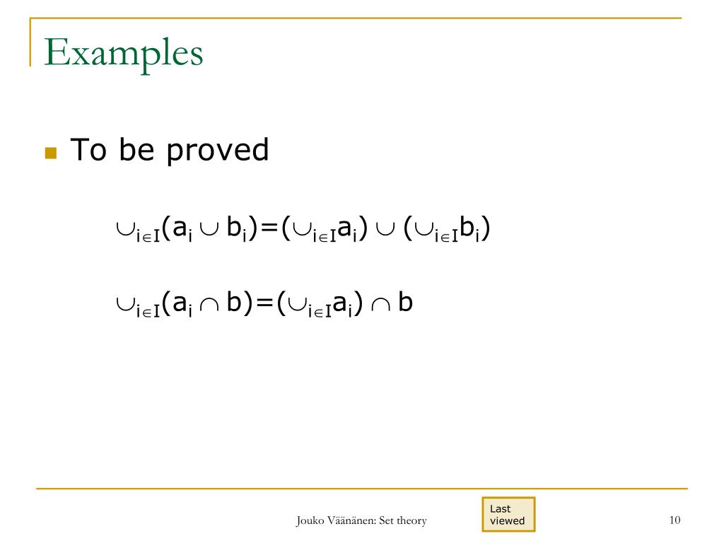 Examples • To be proved iI(ai bi)=(iIai) (iIbi) iI(ai b)=(iIai) b Jouko Väänänen: Set theory