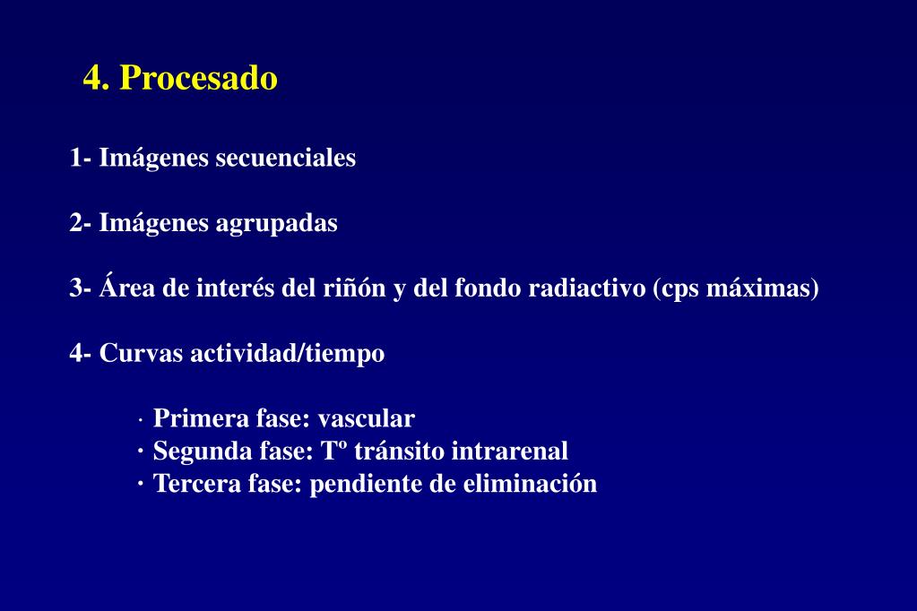 4. Procesado 1- Imágenes secuenciales 2- Imágenes agrupadas 3- Área de interés del riñón y del fondo radiactivo (cps máximas) 4- Curvas actividad/tiempo · Primera fase: vascular · Segunda fase: Tº tránsito intrarenal · Tercera fase: pendiente de eliminación