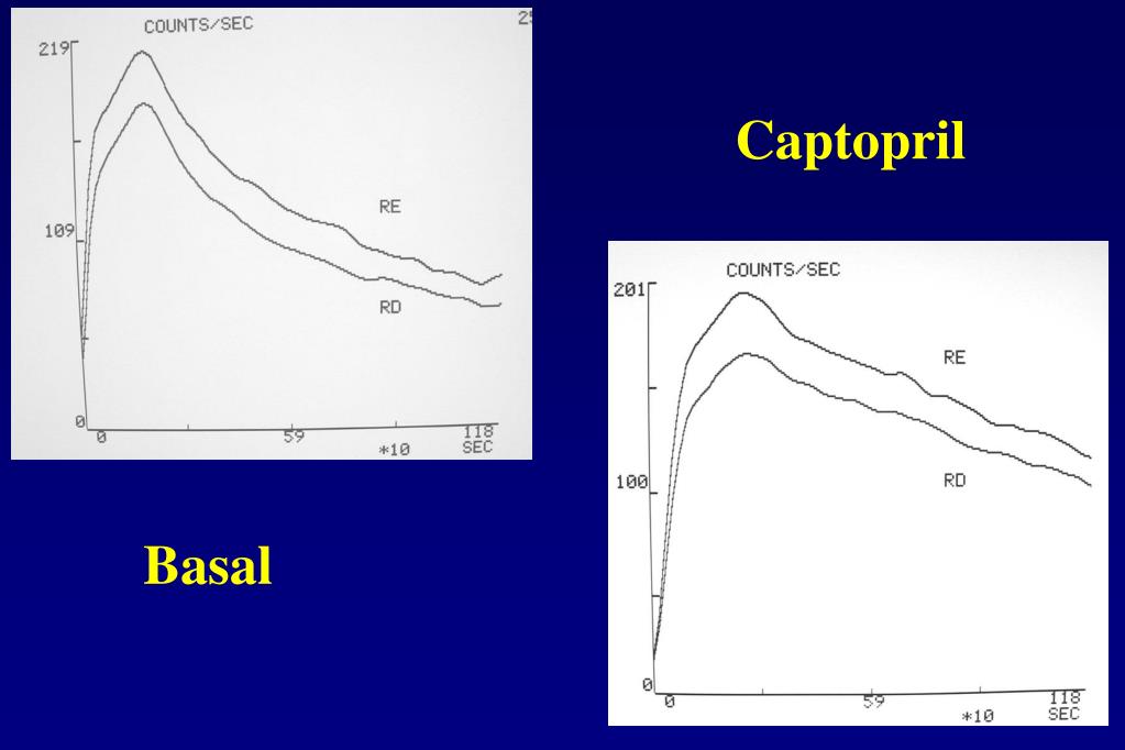 · Metodología: - Renograma basal - Adm. de 25-50 mg. v.o. de captopril (o Losartan) - Tiempo de espera de 1 h. (Losartan 3h.) con control constante de HTA - Renograma post-captopril · Criterios de positividad: - Retención cortical del RF. - Alteración de la función diferencial. - Disminución de la tasa de FG i FPR. - Aumento del tiempo de tránsito intravascular y/o intrarrenal. La negatividad del test descarta HTA de origen renovascular.