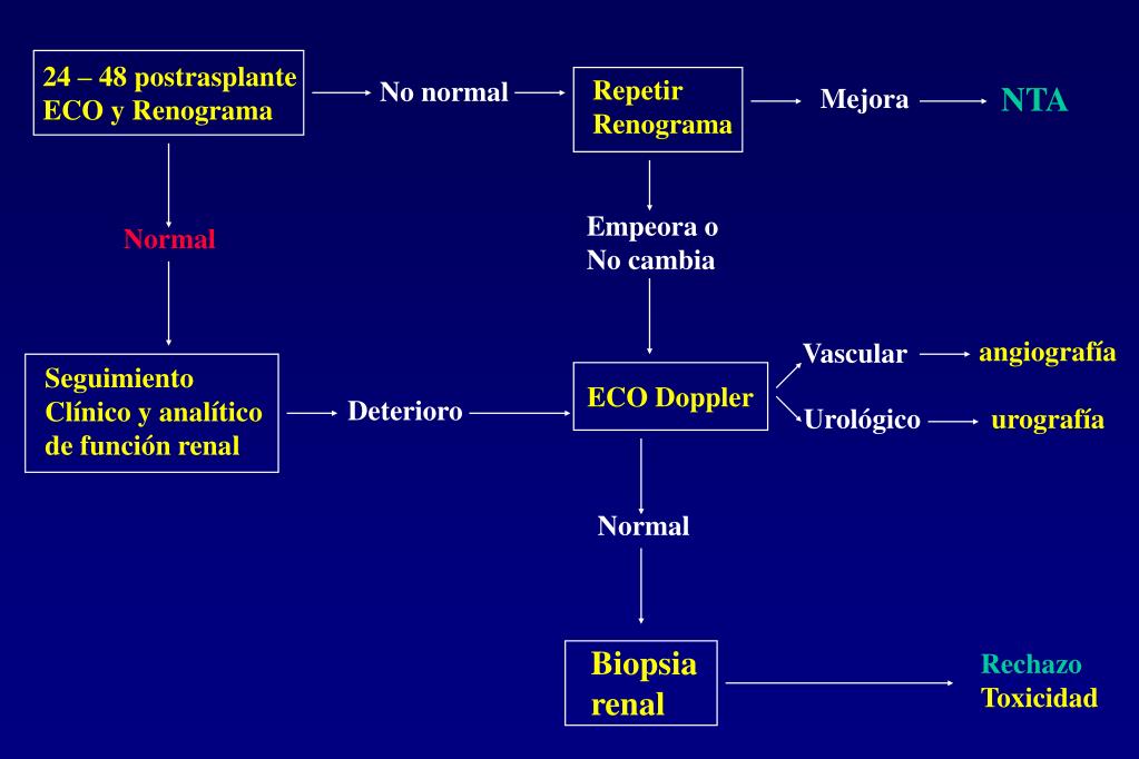 24 – 48 postrasplante ECO y Renograma Repetir Renograma Empeora o No cambia Seguimiento Clínico y analítico de función renal ECO Doppler Deterioro Biopsia renal No normal NTA Mejora Normal angiografía Vascular Urológico urografía Normal Rechazo Toxicidad