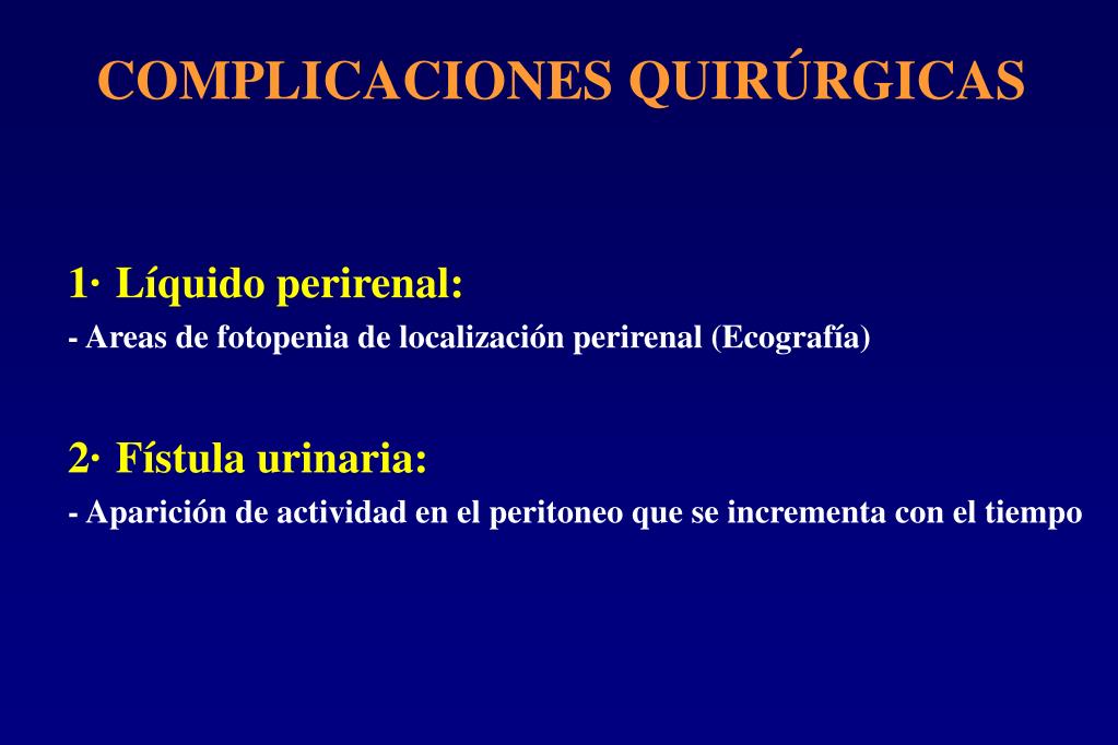 COMPLICACIONES QUIRÚRGICAS 1· Líquido perirenal: - Areas de fotopenia de localización perirenal (Ecografía) 2· Fístula urinaria: - Aparición de actividad en el peritoneo que se incrementa con el tiempo