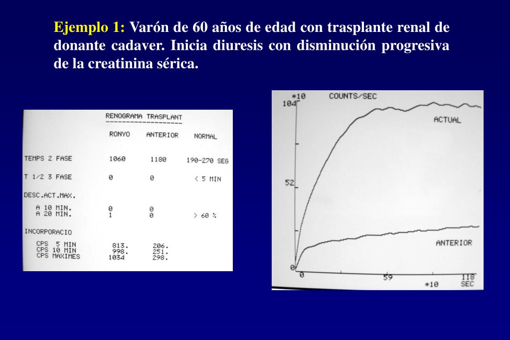 Ejemplo 1: Varón de 60 años de edad con trasplante renal de donante cadaver. Inicia diuresis con disminución progresiva de la creatinina sérica.