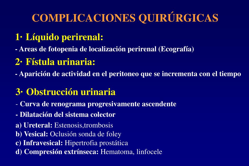 COMPLICACIONES QUIRÚRGICAS 1· Líquido perirenal: - Areas de fotopenia de localización perirenal (Ecografía) 2· Fístula urinaria: - Aparición de actividad en el peritoneo que se incrementa con el tiempo 3· Obstrucción urinaria - Curva de renograma progresivamente ascendente - Dilatación del sistema colector a) Ureteral: Estenosis,trombosis b) Vesical: Oclusión sonda de foley c) Infravesical: Hipertrofia prostática d) Compresión extrínseca: Hematoma, linfocele