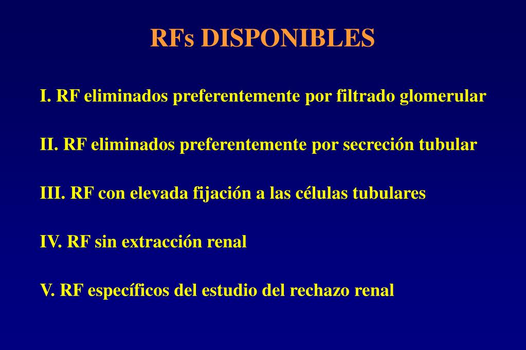 RFs DISPONIBLES I. RF eliminados preferentemente por filtrado glomerular II. RF eliminados preferentemente por secreción tubular III. RF con elevada fijación a las células tubulares IV. RF sin extracción renal V. RF específicos del estudio del rechazo renal