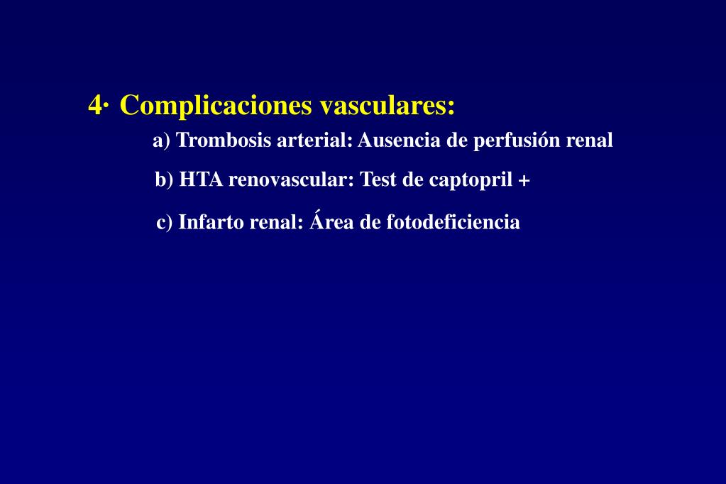 4· Complicaciones vasculares: a) Trombosis arterial: Ausencia de perfusión renal b) HTA renovascular: Test de captopril + c) Infarto renal: Área de fotodeficiencia