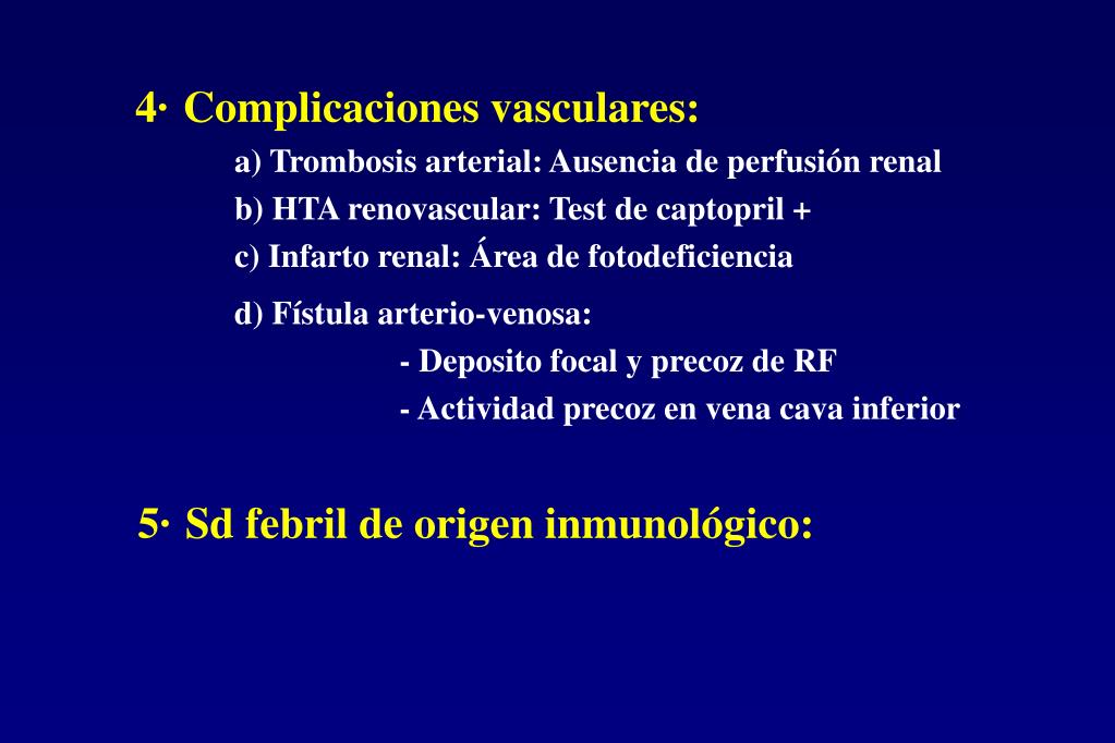 4· Complicaciones vasculares: a) Trombosis arterial: Ausencia de perfusión renal b) HTA renovascular: Test de captopril + c) Infarto renal: Área de fotodeficiencia d) Fístula arterio-venosa: - Deposito focal y precoz de RF - Actividad precoz en vena cava inferior 5· Sd febril de origen inmunológico: