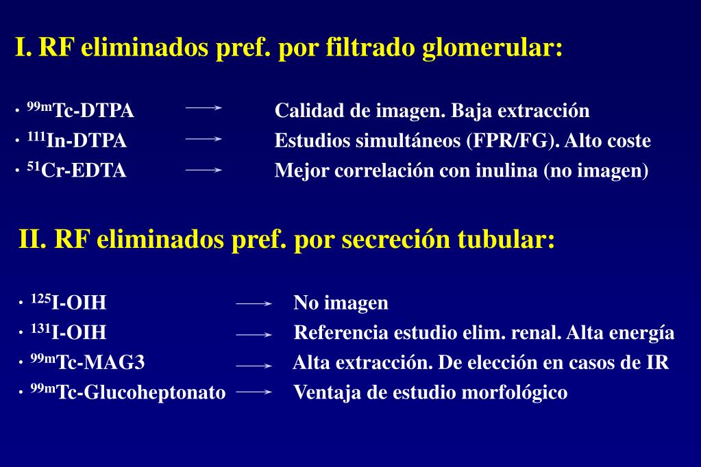I. RF eliminados pref. por filtrado glomerular: · 99mTc-DTPA Calidad de imagen. Baja extracción · 111In-DTPA Estudios simultáneos (FPR/FG). Alto coste · 51Cr-EDTA Mejor correlación con inulina (no imagen) II. RF eliminados pref. por secreción tubular: · 125I-OIH No imagen · 131I-OIH Referencia estudio elim. renal. Alta energía · 99mTc-MAG3 Alta extracción. De elección en casos de IR · 99mTc-Glucoheptonato Ventaja de estudio morfológico