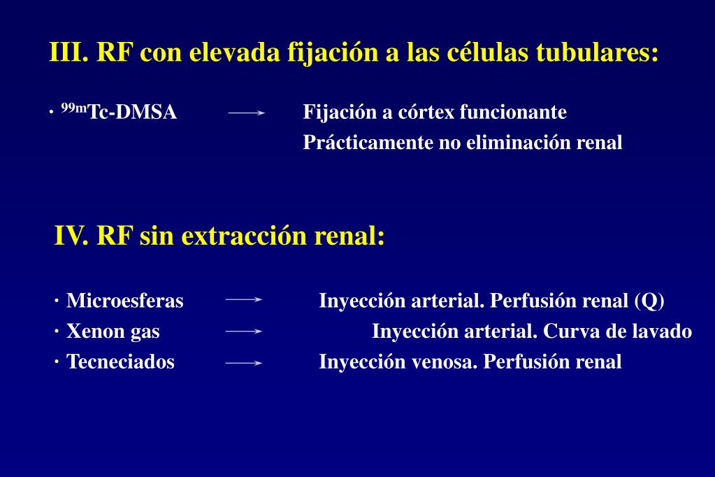 IV. RF sin extracción renal: · Microesferas Inyección arterial. Perfusión renal (Q) · Xenon gas Inyección arterial. Curva de lavado · Tecneciados Inyección venosa. Perfusión renal III. RF con elevada fijación a las células tubulares: · 99mTc-DMSA Fijación a córtex funcionante Prácticamente no eliminación renal