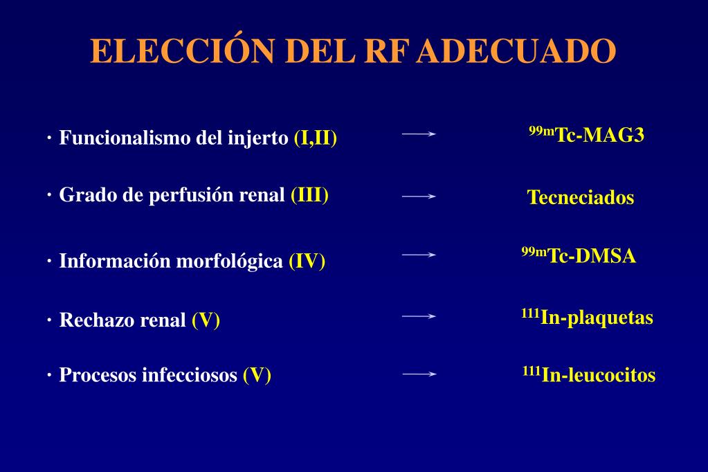 99mTc-MAG3 · Funcionalismo del injerto (I,II) · Grado de perfusión renal (III) Tecneciados 99mTc-DMSA · Información morfológica (IV) 111In-plaquetas · Rechazo renal (V) · Procesos infecciosos (V) 111In-leucocitos ELECCIÓN DEL RF ADECUADO