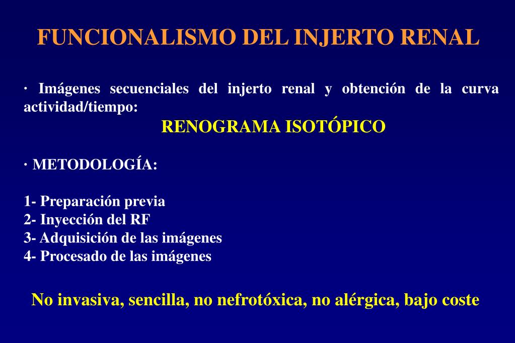 FUNCIONALISMO DEL INJERTO RENAL · Imágenes secuenciales del injerto renal y obtención de la curva actividad/tiempo: RENOGRAMA ISOTÓPICO · METODOLOGÍA: 1- Preparación previa 2- Inyección del RF 3- Adquisición de las imágenes 4- Procesado de las imágenes No invasiva, sencilla, no nefrotóxica, no alérgica, bajo coste