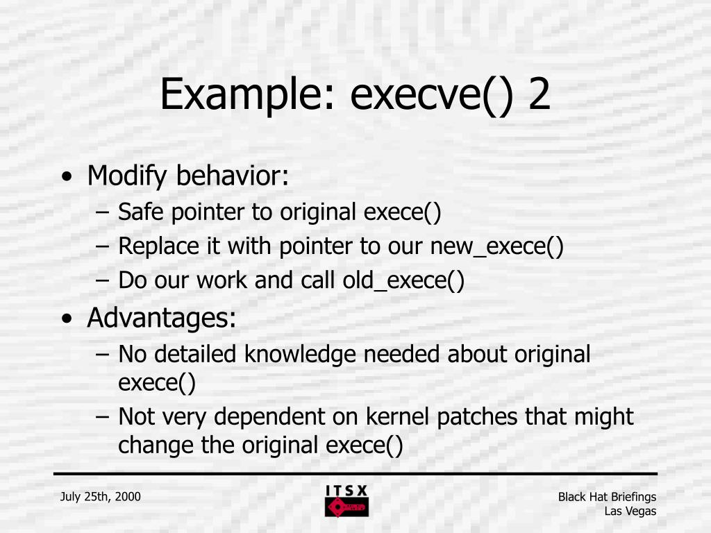 Example: execve() 2 • Modify behavior: • Safe pointer to original exece() • Replace it with pointer to our new_exece() • Do our work and call old_exece() • Advantages: • No detailed knowledge needed about original exece() • Not very dependent on kernel patches that might change the original exece()