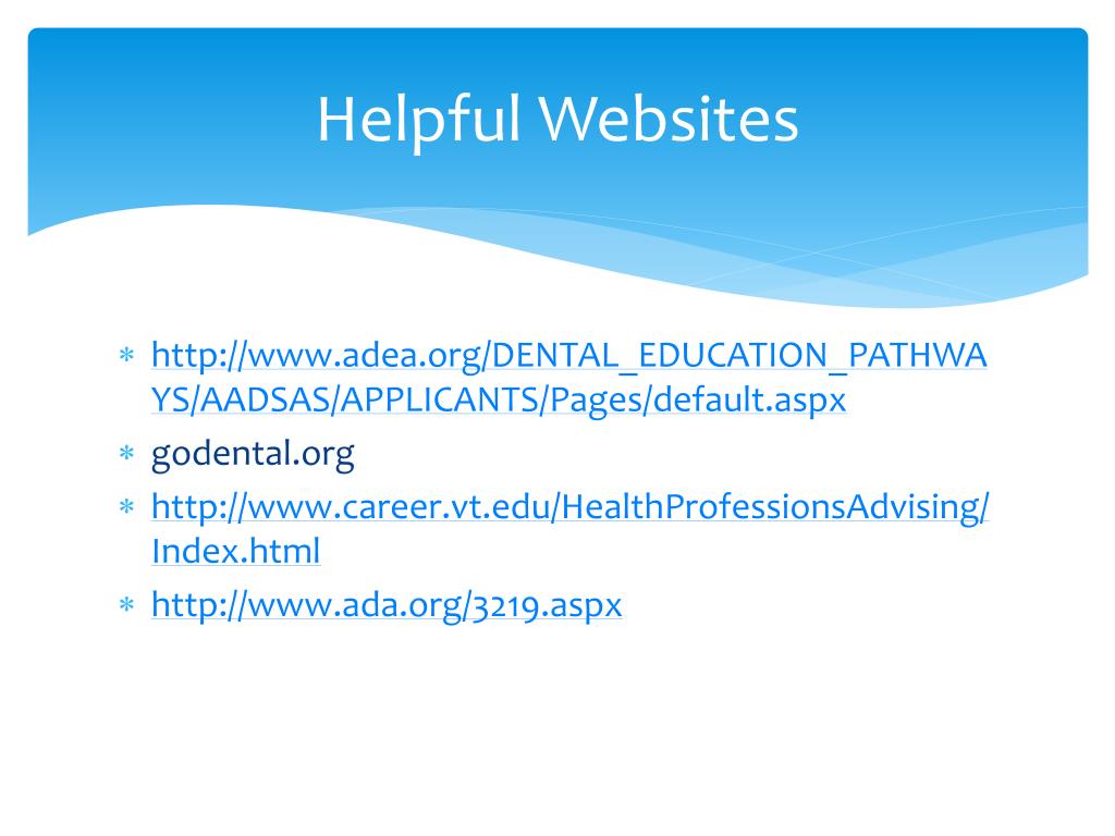 Helpful Websites http://www.adea.org/DENTAL_EDUCATION_PATHWAYS/AADSAS/APPLICANTS/Pages/default.aspx godental.org http://www.career.vt.edu/HealthProfessionsAdvising/Index.html http://www.ada.org/3219.aspx