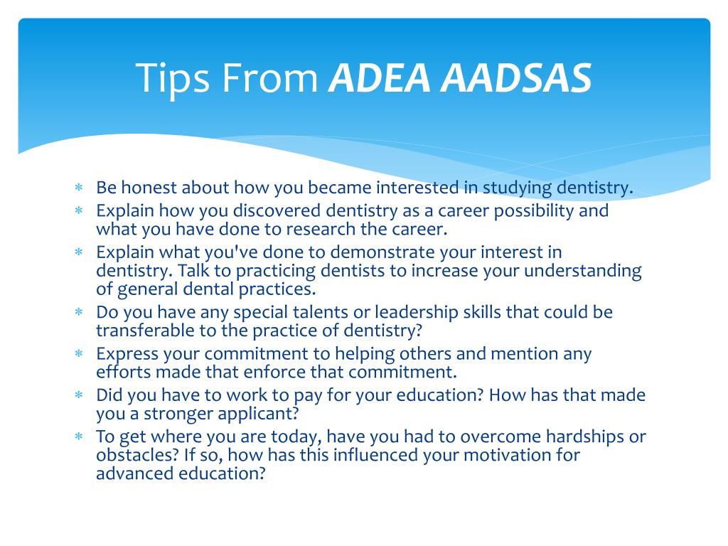 Tips From ADEAAADSAS • Be honest about how you became interested in studying dentistry. • Explain how you discovered dentistry as a career possibility and what you have done to research the career. • Explain what you've done to demonstrate your interest in dentistry. Talk to practicing dentists to increase your understanding of general dental practices. • Do you have any special talents or leadership skills that could be transferable to the practice of dentistry? • Express your commitment to helping others and mention any efforts made that enforce that commitment. • Did you have to work to pay for your education? How has that made you a stronger applicant? • To get where you are today, have you had to overcome hardships or obstacles? If so, how has this influenced your motivation for advanced education?