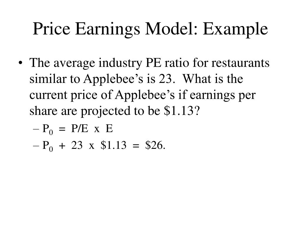 Price Earnings Model: Example • The average industry PE ratio for restaurants similar to Applebee’s is 23. What is the current price of Applebee’s if earnings per share are projected to be $1.13? • P0 = P/E x E • P0 + 23 x $1.13 = $26.