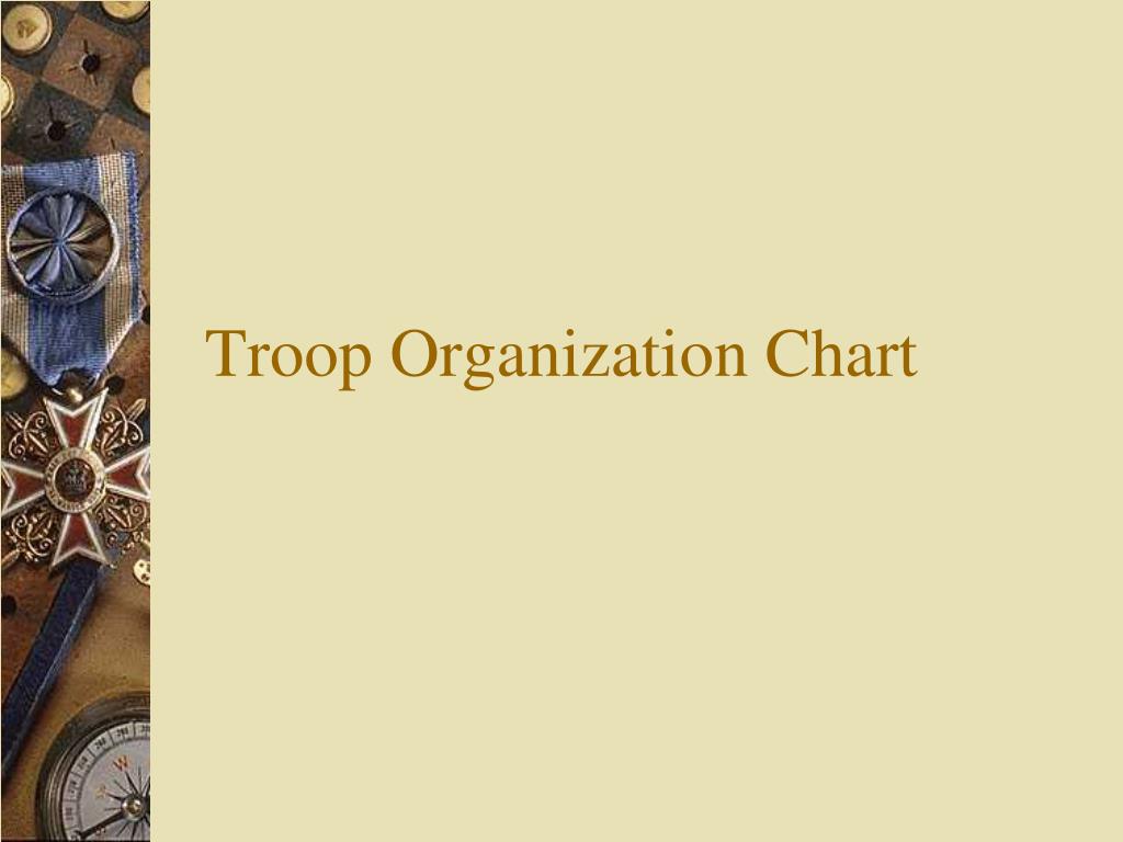 TROOP ORGANIZATION CHART for a Large Troop Scoutmaster Assistant Scoutmaster New Scout Junior Assistant Scoutmaster Assistant Scoutmaster Venture Assistant Senior Patrol Leader Senior Patrol Leader Patrol Leaders' Council Troop Guide New-Scout Patrol Leader Patrol Leader Patrol Leader Patrol Leader Venture Patrol Den Chief Assistant Patrol Leader Assistant Patrol Leader Assistant Patrol Leader Patrol Scribe Quartermaster Grubmaster Cheermaster Patrol Scribe Quartermaster Grubmaster Cheermaster Patrol Scribe Quartermaster Grubmaster Cheermaster OA Troop Representative Instructor Quartermaster Scribe Librarian Historian Chaplain's Aide