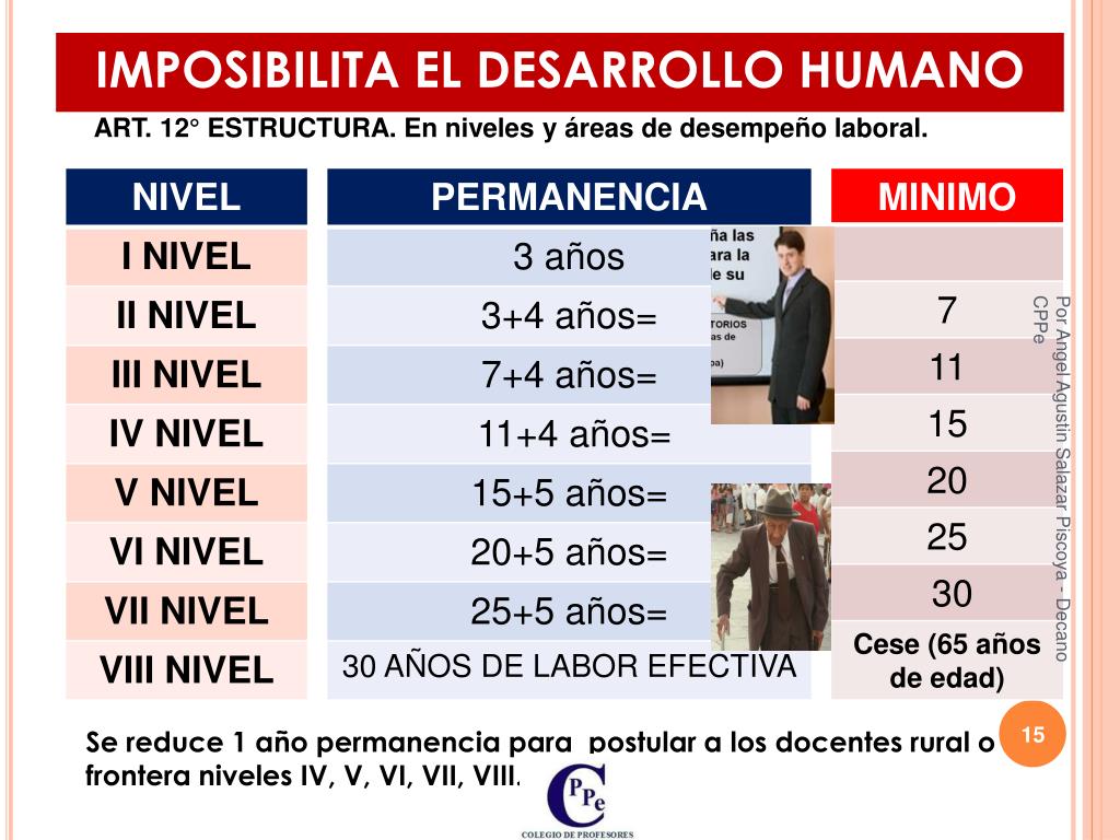 IMPOSIBILITA EL DESARROLLO HUMANO ART. 12° ESTRUCTURA. En niveles y áreas de desempeño laboral. Por Angel Agustin Salazar Piscoya - Decano CPPe Se reduce 1 año permanencia para postular a los docentes rural o frontera niveles IV, V, VI, VII, VIII.