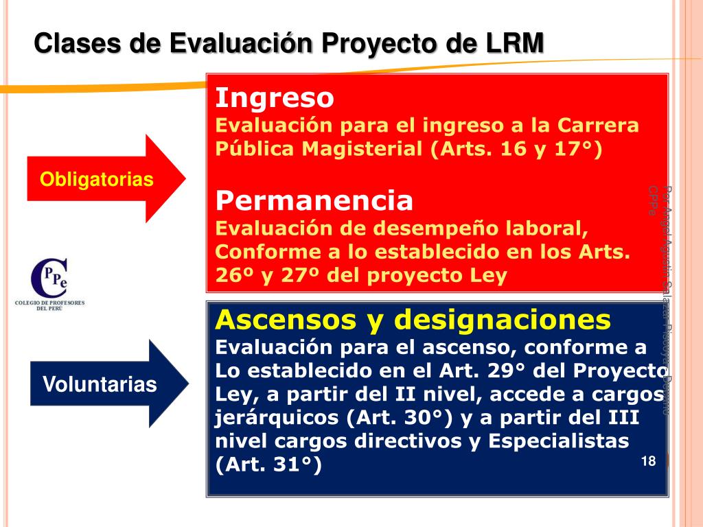 Clases de Evaluación Proyecto de LRM Ingreso Evaluación para el ingreso a la Carrera Pública Magisterial (Arts. 16 y 17°) Permanencia Evaluación de desempeño laboral, Conforme a lo establecido en los Arts. 26º y 27º del proyecto Ley Obligatorias Por Angel Agustin Salazar Piscoya - Decano CPPe Ascensos y designaciones Evaluación para el ascenso, conforme a Lo establecido en el Art. 29° del Proyecto Ley, a partir del II nivel, accede a cargos jerárquicos (Art. 30°) y a partir del III nivel cargos directivos y Especialistas (Art. 31°) Voluntarias