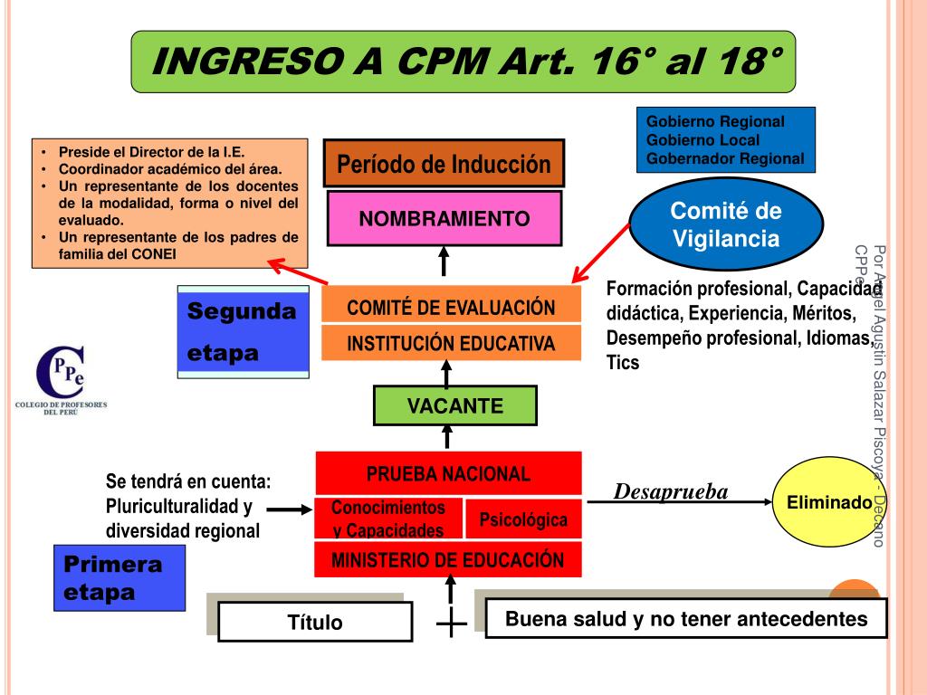 Desaprueba INGRESO A CPM Art. 16° al 18° Gobierno Regional Gobierno Local Gobernador Regional • Preside el Director de la I.E. • Coordinador académico del área. • Un representante de los docentes de la modalidad, forma o nivel del evaluado. • Un representante de los padres de familia del CONEI Período de Inducción Comité de Vigilancia NOMBRAMIENTO Formación profesional, Capacidad didáctica, Experiencia, Méritos, Desempeño profesional, Idiomas,Tics COMITÉ DE EVALUACIÓN Segunda etapa INSTITUCIÓN EDUCATIVA Por Angel Agustin Salazar Piscoya - Decano CPPe VACANTE PRUEBA NACIONAL Eliminado Se tendrá en cuenta: Pluriculturalidad y diversidad regional Conocimientosy Capacidades Psicológica MINISTERIO DE EDUCACIÓN Primera etapa Buena salud y no tener antecedentes Título