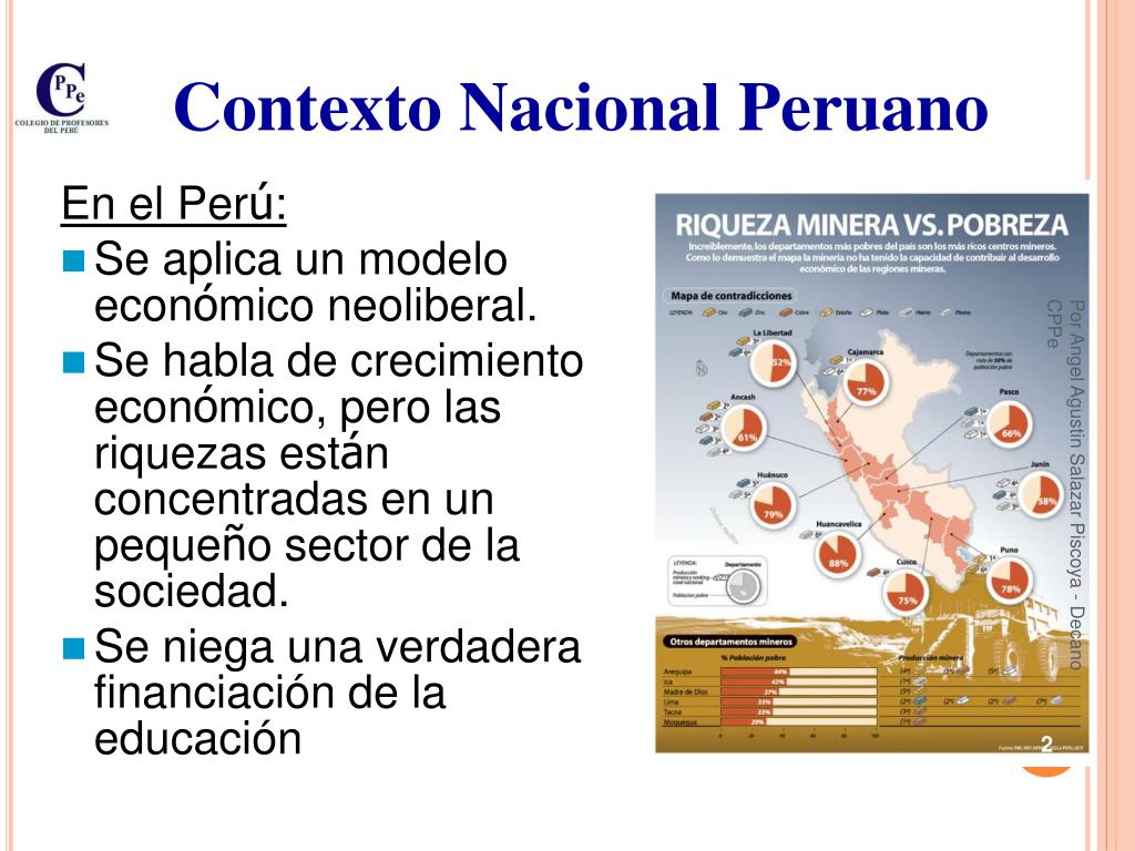 Contexto Nacional Peruano • En el Perú: • Se aplica un modelo económico neoliberal. • Se habla de crecimiento económico, pero las riquezas están concentradas en un pequeño sector de la sociedad. • Se niega una verdadera financiación de la educación Por Angel Agustin Salazar Piscoya - Decano CPPe