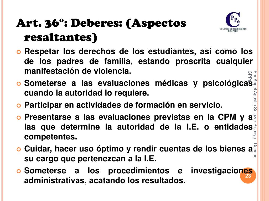 Art. 36°: Deberes: (Aspectos resaltantes) • Respetar los derechos de los estudiantes, así como los de los padres de familia, estando proscrita cualquier manifestación de violencia. • Someterse a las evaluaciones médicas y psicológicas cuando la autoridad lo requiere. • Participar en actividades de formación en servicio. • Presentarse a las evaluaciones previstas en la CPM y a las que determine la autoridad de la I.E. o entidades competentes. • Cuidar, hacer uso óptimo y rendir cuentas de los bienes a su cargo que pertenezcan a la I.E. • Someterse a los procedimientos e investigaciones administrativas, acatando los resultados. Por Angel Agustin Salazar Piscoya - Decano CPPe