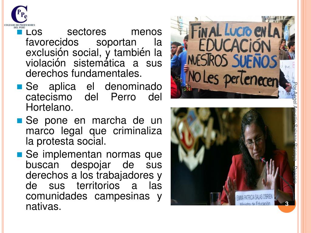 Los sectores menos favorecidos soportan la exclusión social, y también la violación sistemática a sus derechos fundamentales. • Se aplica el denominado catecismo del Perro del Hortelano. • Se pone en marcha de un marco legal que criminaliza la protesta social. • Se implementan normas que buscan despojar de sus derechos a los trabajadores y de sus territorios a las comunidades campesinas y nativas. Por Angel Agustin Salazar Piscoya - Decano CPPe
