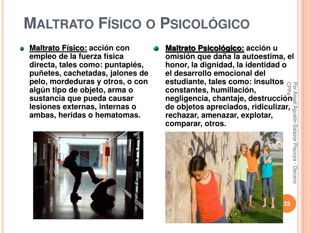 Maltrato Físico o Psicológico • Maltrato Físico:acción con empleo de la fuerza física directa, tales como: puntapiés, puñetes, cachetadas, jalones de pelo, mordeduras y otros, o con algún tipo de objeto, arma o sustancia que pueda causar lesiones externas, internas o ambas, heridas o hematomas. Maltrato Psicológico:acción u omisión que daña la autoestima, el honor, la dignidad, la identidad o el desarrollo emocional del estudiante, tales como: insultos constantes, humillación, negligencia, chantaje, destrucción de objetos apreciados, ridiculizar, rechazar, amenazar, explotar, comparar, otros. Por Angel Agustin Salazar Piscoya - Decano CPPe