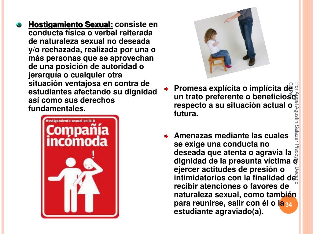 Hostigamiento Sexual:consiste en conducta física o verbal reiterada de naturaleza sexual no deseada y/o rechazada, realizada por una o más personas que se aprovechan de una posición de autoridad o jerarquía o cualquier otra situación ventajosa en contra de estudiantes afectando su dignidad así como sus derechos fundamentales. • Promesa explícita o implícita de un trato preferente o beneficioso respecto a su situación actual o futura. • Amenazas mediante las cuales se exige una conducta no deseada que atenta o agravia la dignidad de la presunta víctima o ejercer actitudes de presión o intimidatorios con la finalidad de recibir atenciones o favores de naturaleza sexual, como también para reunirse, salir con él o la estudiante agraviado(a). Por Angel Agustin Salazar Piscoya - Decano CPPe