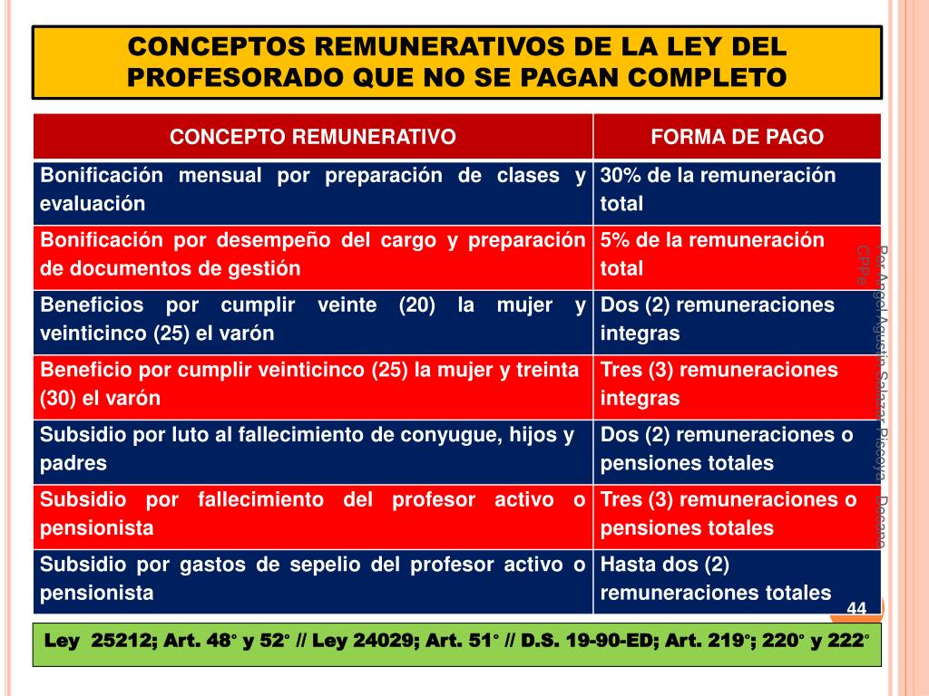 CONCEPTOS REMUNERATIVOS DE LA LEY DEL PROFESORADO QUE NO SE PAGAN COMPLETO Por Angel Agustin Salazar Piscoya - Decano CPPe Ley 25212; Art. 48° y 52° // Ley 24029; Art. 51° // D.S. 19-90-ED; Art. 219°; 220° y 222°