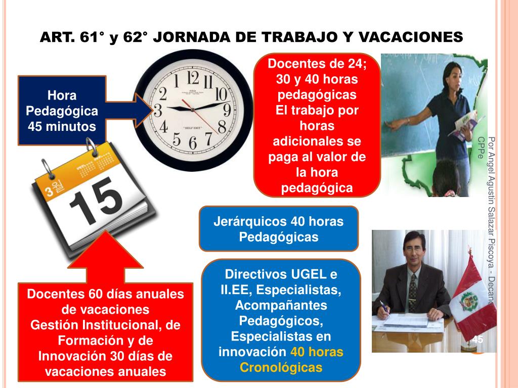 ART. 61° y 62° JORNADA DE TRABAJO Y VACACIONES Docentes de 24; 30 y 40 horas pedagógicas El trabajo por horas adicionales se paga al valor de la hora pedagógica Hora Pedagógica 45 minutos Jerárquicos 40 horas Pedagógicas Por Angel Agustin Salazar Piscoya - Decano CPPe Docentes 60 días anuales de vacaciones Gestión Institucional, de Formación y de Innovación 30 días de vacaciones anuales Directivos UGEL e II.EE, Especialistas, Acompañantes Pedagógicos, Especialistas en innovación 40 horas Cronológicas