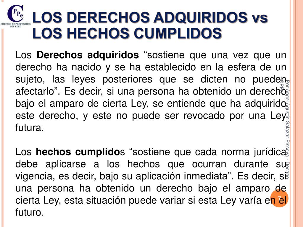 LOS DERECHOS ADQUIRIDOS vs LOS HECHOS CUMPLIDOS Los Derechos adquiridos “sostiene que una vez que un derecho ha nacido y se ha establecido en la esfera de un sujeto, las leyes posteriores que se dicten no pueden afectarlo”. Es decir, si una persona ha obtenido un derecho bajo el amparo de cierta Ley, se entiende que ha adquirido este derecho, y este no puede ser revocado por una Ley futura. Los hechos cumplidos “sostiene que cada norma jurídica debe aplicarse a los hechos que ocurran durante su vigencia, es decir, bajo su aplicación inmediata”. Es decir, si una persona ha obtenido un derecho bajo el amparo de cierta Ley, esta situación puede variar si esta Ley varía en el futuro. Por Angel Agustin Salazar Piscoya - Decano CPPe