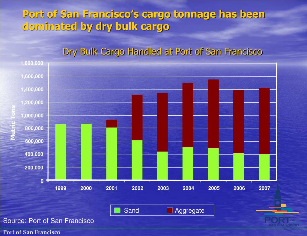 Port of San Francisco’s cargo tonnage has been dominated by dry bulk cargo Sand Aggregate Dry Bulk Cargo Handled at Port of San Francisco 1,800,000 1,600,000 1,400,000 1,200,000 1,000,000 Metric Tons 800,000 600,000 400,000 200,000 0 1999 2000 2001 2002 2003 2004 2005 2006 2007 Source: Port of San Francisco