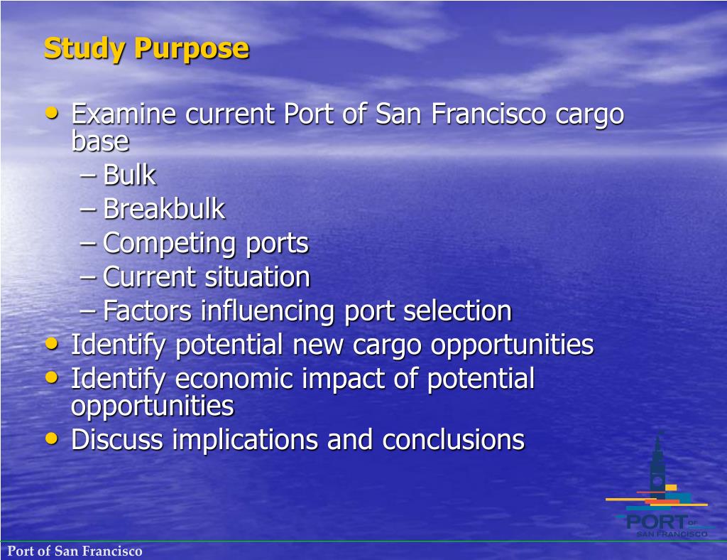 Study Purpose Examine current Port of San Francisco cargo base Bulk Breakbulk Competing ports Current situation Factors influencing port selection Identify potential new cargo opportunities Identify economic impact of potential opportunities Discuss implications and conclusions
