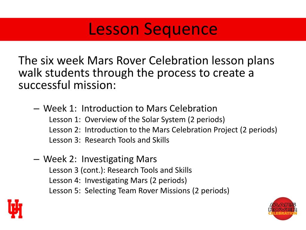 Lesson Sequence The six week Mars Rover Celebration lesson plans walk students through the process to create a successful mission: • Week 1: Introduction to Mars Celebration Lesson 1: Overview of the Solar System (2 periods) Lesson 2: Introduction to the Mars Celebration Project (2 periods) Lesson 3: Research Tools and Skills • Week 2: Investigating Mars Lesson 3 (cont.): Research Tools and Skills Lesson 4: Investigating Mars (2 periods) Lesson 5: Selecting Team Rover Missions (2 periods)