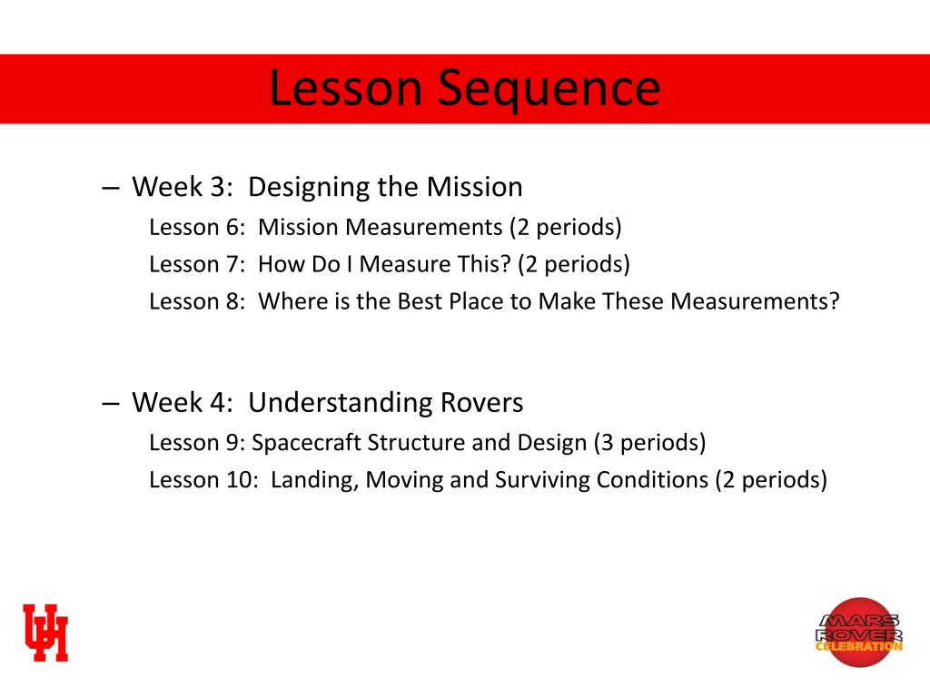 Lesson Sequence • Week 3: Designing the Mission Lesson 6: Mission Measurements (2 periods) Lesson 7: How Do I Measure This? (2 periods) Lesson 8: Where is the Best Place to Make These Measurements? • Week 4: Understanding Rovers Lesson 9: Spacecraft Structure and Design (3 periods) Lesson 10: Landing, Moving and Surviving Conditions (2 periods)