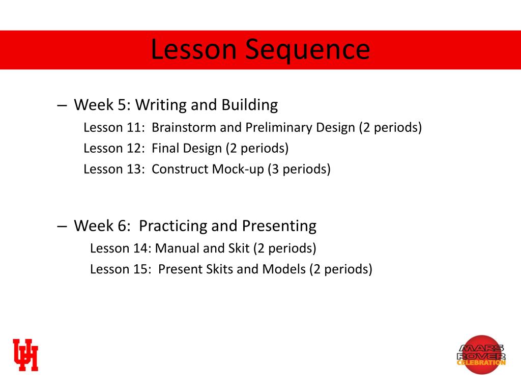 Lesson Sequence • Week 5: Writing and Building Lesson 11: Brainstorm and Preliminary Design (2 periods) Lesson 12: Final Design (2 periods) Lesson 13: Construct Mock-up (3 periods) • Week 6: Practicing and Presenting Lesson 14: Manual and Skit (2 periods) Lesson 15: Present Skits and Models (2 periods)