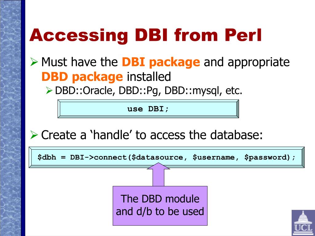 Create a ‘handle’ to access the database: $dbh = DBI->connect($datasource, $username, $password); The DBD module and d/b to be used Accessing DBI from Perl • Must have the DBI package and appropriate DBD package installed • DBD::Oracle, DBD::Pg, DBD::mysql, etc. use DBI;