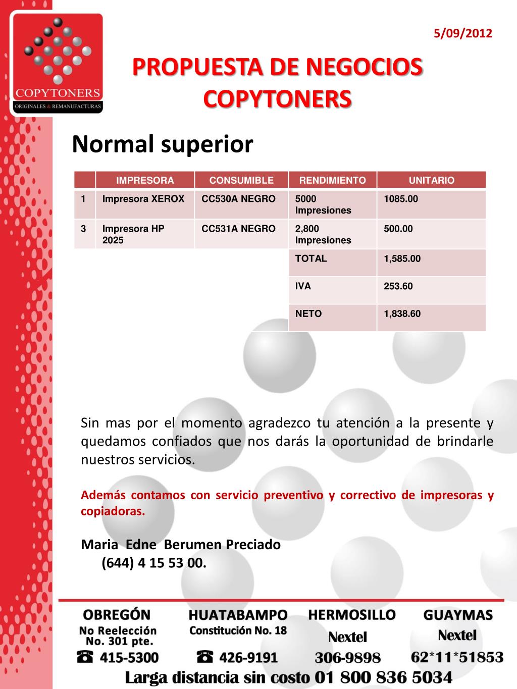 5/09/2012 PROPUESTA DE NEGOCIOS COPYTONERS Normal superior Sin mas por el momento agradezco tu atención a la presente y quedamos confiados que nos darás la oportunidad de brindarle nuestros servicios. Además contamos con servicio preventivo y correctivo de impresoras y copiadoras. Maria Edne Berumen Preciado (644) 4 15 53 00.