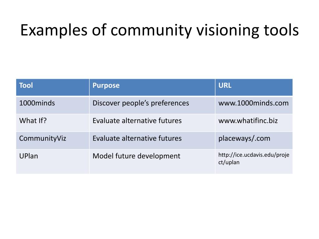 Community Visioning • Spatial understanding • Setting goals • Exposing tradeoffs • Weighting multiple criteria • Examining alternative futures http://placeways.com/