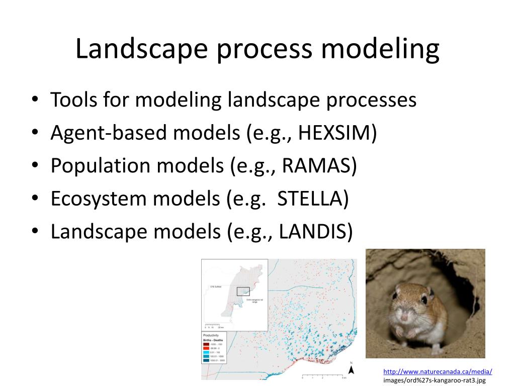 Landscape process modeling • Tools for modeling landscape processes • Agent-based models (e.g., HEXSIM) • Population models (e.g., RAMAS) • Ecosystem models (e.g. STELLA) • Landscape models (e.g., LANDIS) http://www.naturecanada.ca/media/ images/ord%27s-kangaroo-rat3.jpg