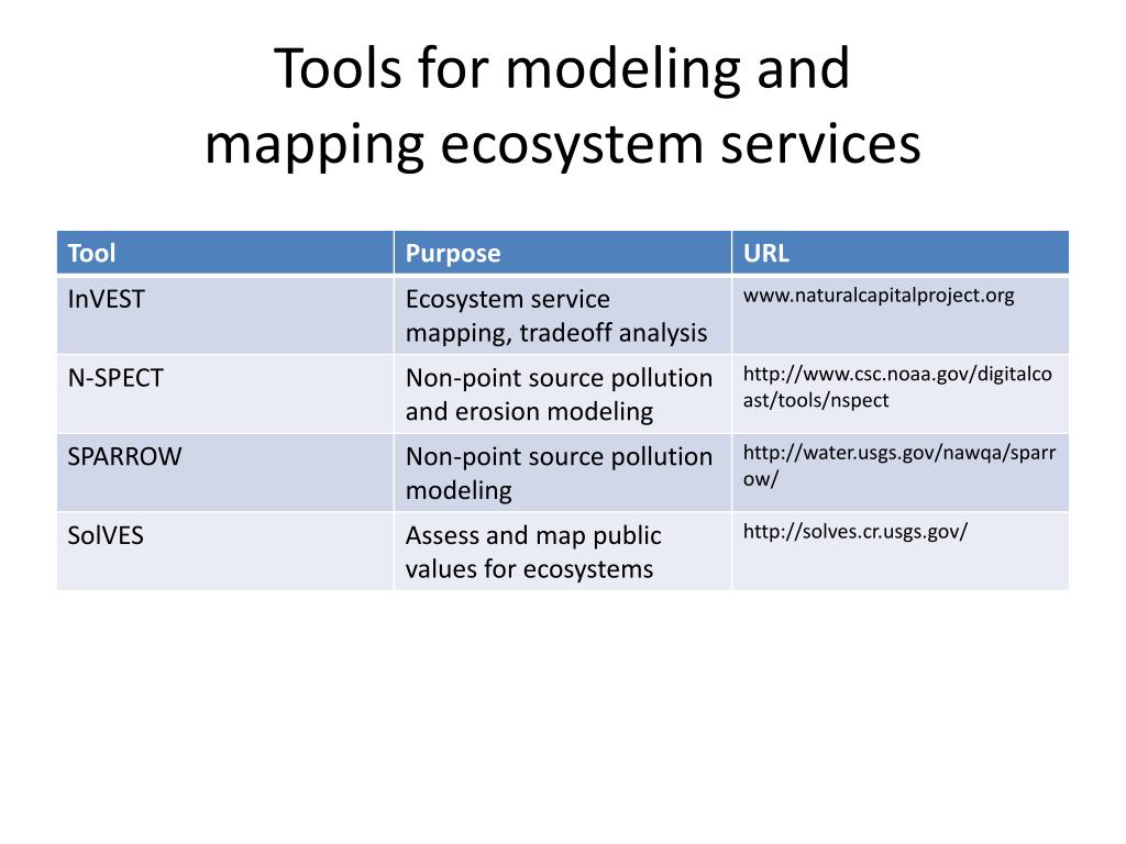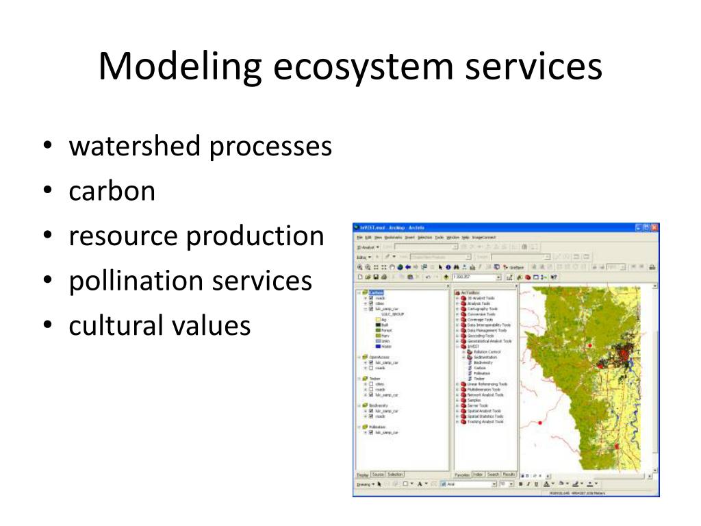 Modeling ecosystem services • watershed processes • carbon • resource production • pollination services • cultural values