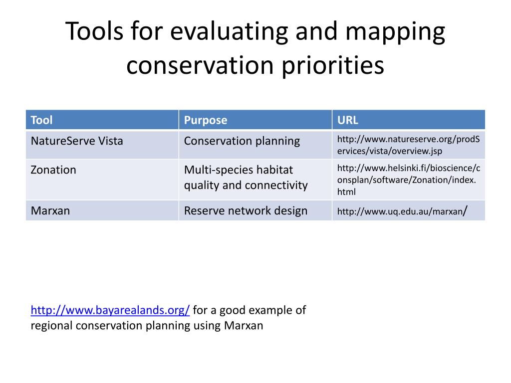 Tools for evaluating and mapping conservation priorities http://www.bayarealands.org/ for a good example of regional conservation planning using Marxan