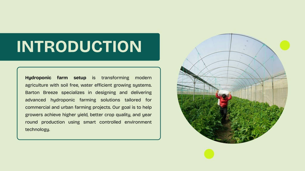 INTRODUCTION • Hydroponic farm setup is transforming modern agriculture with soil free, water efficient growing systems. Barton Breeze specializes in designing and delivering advanced hydroponic farming solutions tailored for commercial and urban farming projects. Our goal is to help growers achieve higher yield, better crop quality, and year round production using smart controlled environment technology.