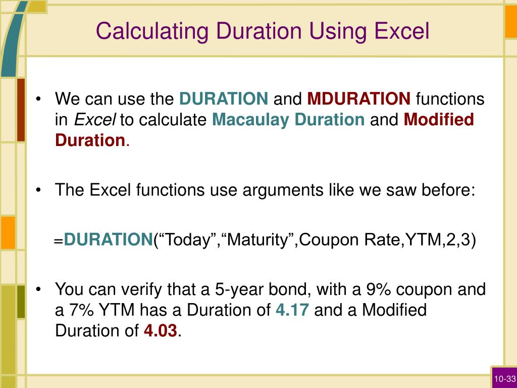 Calculating Duration Using Excel • We can use the DURATION and MDURATION functions in Excel to calculate Macaulay Duration and Modified Duration. • The Excel functions use arguments like we saw before: =DURATION(“Today”,“Maturity”,Coupon Rate,YTM,2,3) • You can verify that a 5-year bond, with a 9% coupon and a 7% YTM has a Duration of 4.17 and a Modified Duration of 4.03.
