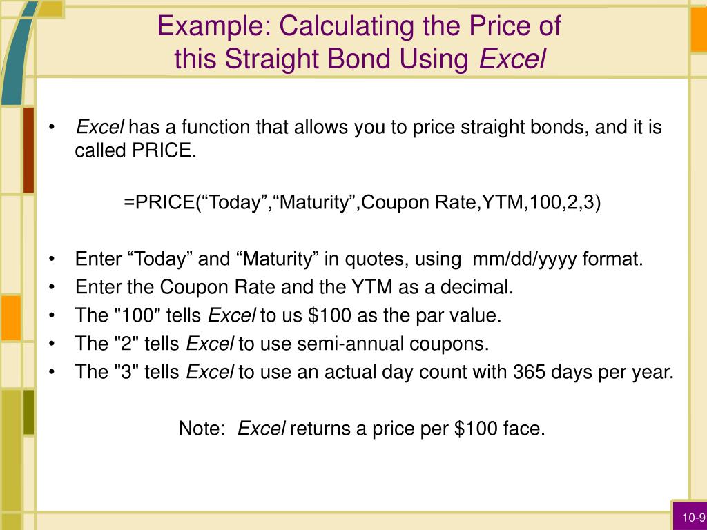 Example: Calculating the Price of this Straight Bond Using Excel • Excel has a function that allows you to price straight bonds, and it is called PRICE. =PRICE(“Today”,“Maturity”,Coupon Rate,YTM,100,2,3) • Enter “Today” and “Maturity” in quotes, using mm/dd/yyyy format. • Enter the Coupon Rate and the YTM as a decimal. • The "100" tells Excel to us $100 as the par value. • The "2" tells Excel to use semi-annual coupons. • The "3" tells Excel to use an actual day count with 365 days per year. Note: Excel returns a price per $100 face.