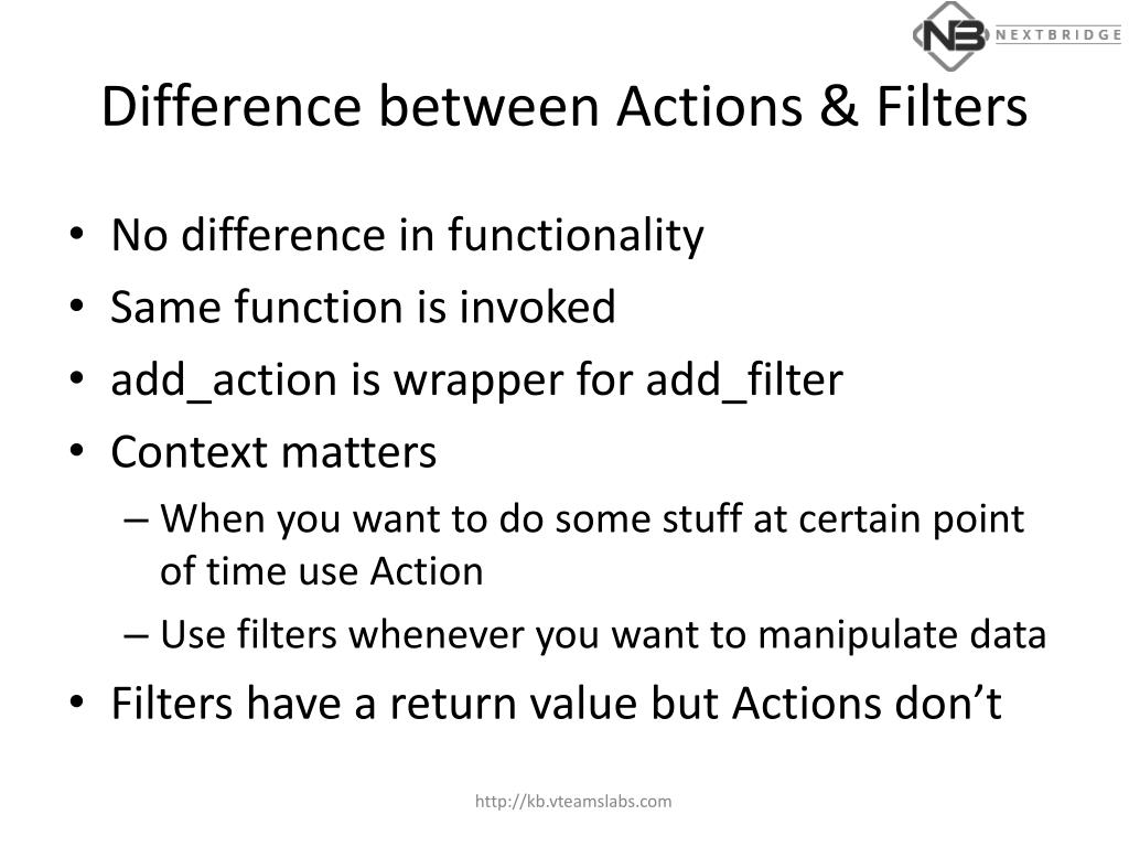Difference between Actions & Filters • No difference in functionality • Same function is invoked • add_action is wrapper for add_filter • Context matters • When you want to do some stuff at certain point of time use Action • Use filters whenever you want to manipulate data • Filters have a return value but Actions don’t http://kb.vteamslabs.com