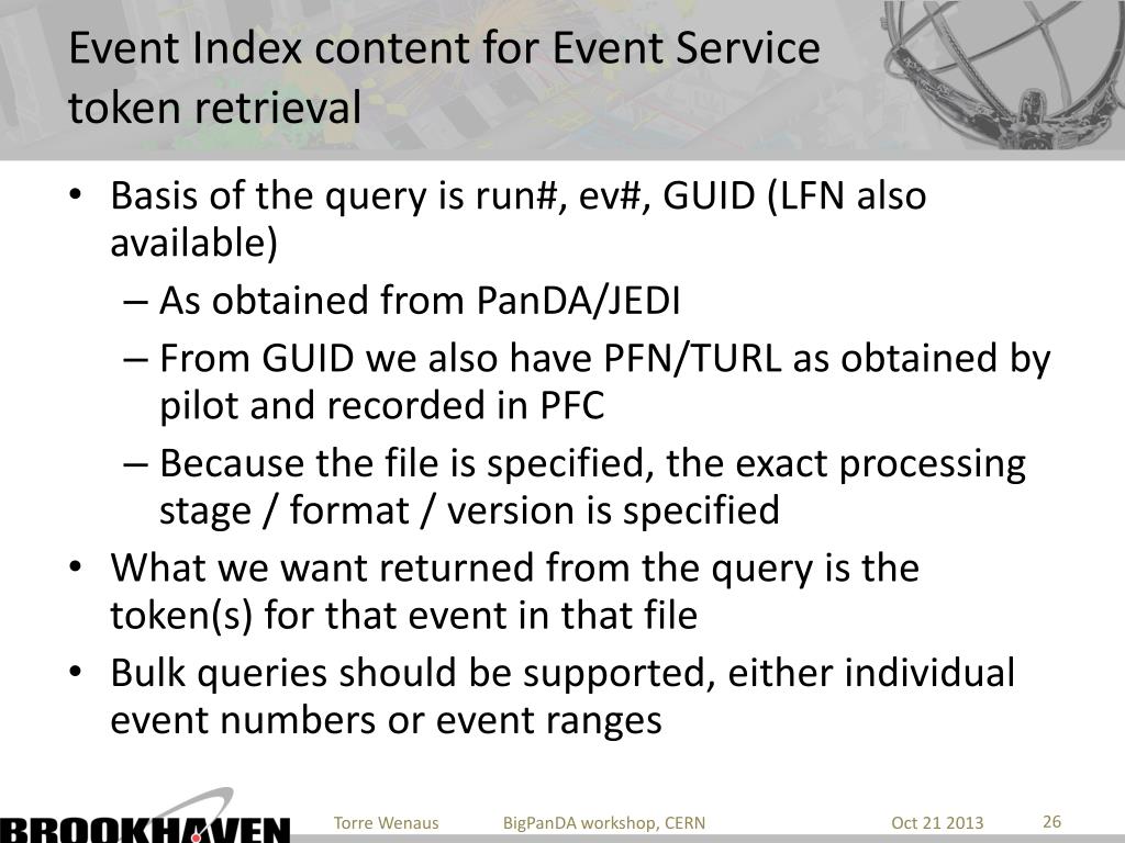 Event Index content for Event Service token retrieval • Basis of the query is run#, ev#, GUID (LFN also available) • As obtained from PanDA/JEDI • From GUID we also have PFN/TURL as obtained by pilot and recorded in PFC • Because the file is specified, the exact processing stage / format / version is specified • What we want returned from the query is the token(s) for that event in that file • Bulk queries should be supported, either individual event numbers or event ranges Torre Wenaus BigPanDA workshop, CERN