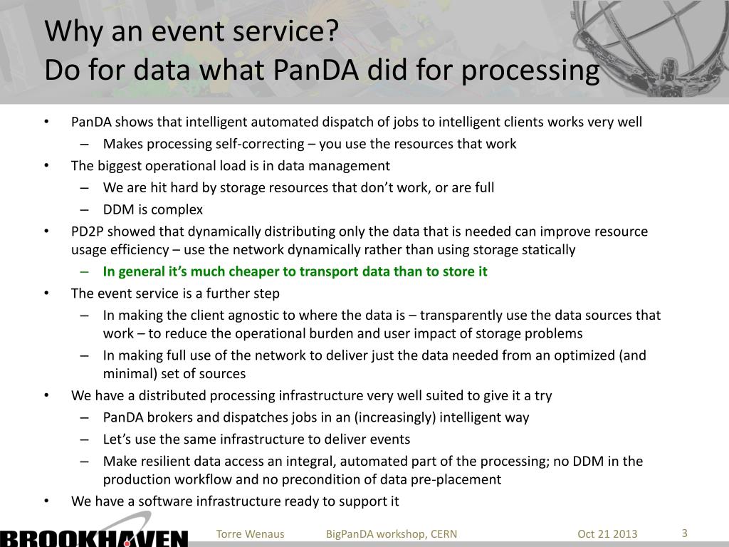 Why an event service?Do for data what PanDA did for processing • PanDA shows that intelligent automated dispatch of jobs to intelligent clients works very well • Makes processing self-correcting – you use the resources that work • The biggest operational load is in data management • We are hit hard by storage resources that don’t work, or are full • DDM is complex • PD2P showed that dynamically distributing only the data that is needed can improve resource usage efficiency – use the network dynamically rather than using storage statically • In general it’s much cheaper to transport data than to store it • The event service is a further step • In making the client agnostic to where the data is – transparently use the data sources that work – to reduce the operational burden and user impact of storage problems • In making full use of the network to deliver just the data needed from an optimized (and minimal) set of sources • We have a distributed processing infrastructure very well suited to give it a try • PanDA brokers and dispatches jobs in an (increasingly) intelligent way • Let’s use the same infrastructure to deliver events • Make resilient data access an integral, automated part of the processing; no DDM in the production workflow and no precondition of data pre-placement • We have a software infrastructure ready to support it Torre Wenaus BigPanDA workshop, CERN